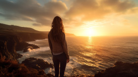 A young woman stands on a cliff overlooking the ocean