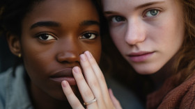 Two friends sharing a secret smile