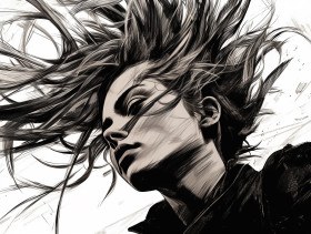 Woman with long flowing hair in black and white