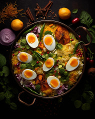 Basmati rice slowly cooked with masala roasted egg and spices served with yogurt dip