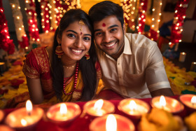 diwali india couple young happy festival festive celebration celebration time joy happiness love togetherness family friends relatives food drinks sweets snacks crackers fireworks diyas rangoli traditional ethnic dress costume culture heritage tradition celebration of lightImagine Buddy