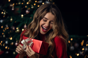 christmas gift surprise girlfriend boyfriend couple love relationship happy joy excited present holiday celebration romantic xmas winter snow christmas tree ornaments decorations lights fireplace cozy warm together family friends family happiness excitement anticipation love gift giving receiving unwrapping opening box ribbon bow paper tag merry christmasImagine Buddy