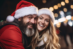 A photo of a happy couple having fun on christmas eve outside, christmas festival people image