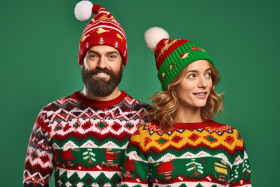 A picture of a young man and woman wearing christmas sweaters and knitted hats on a colored background, christmas festival people image