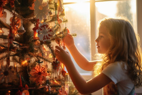 Picture of a mother and daughter putting up a christmas tree in front of a window with a sunset and sunlight shining in, christmas festival people image