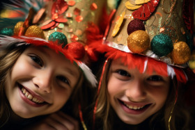 A close up photo of two pretty girls wearing new years hats, christmas festival people image