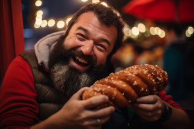 A photo of a happy man eating trdelnik a sweet pastry with his arm around his father at a christmas market, christmas festival people image