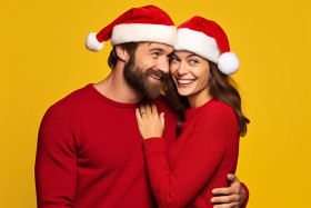christmas couple friends young smiling santa hat sweater red yellow studio isolated hugging holding hands crossed arms happy merry festive holiday celebration joy love togetherness friendship romance winter snow ice reindeer sleigh gifts presents tree decorations lights ornaments bells ribbon tinsel garland wreath cheer fun love joy happiness peace goodwillImagine Buddy