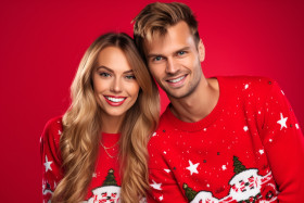 A picture of two people wearing red christmas sweaters, standing in front of a colorful background, christmas festival people image