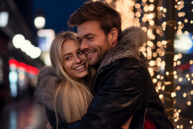 Photo of a guy piggybacking his girlfriend outside at night under christmas lights, both wearing winter clothes, christmas festival people image