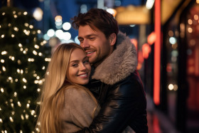 Photo of a guy piggybacking his girlfriend outside at night under christmas lights, both wearing winter clothes, christmas festival people image