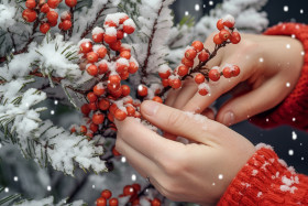 A photo of a mother and daughter decorating a christmas tree in a snowy winter scene outdoors, christmas festival people image