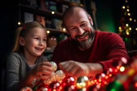 christmas ornaments man daughter happy family holiday winter love joy togetherness celebration festive fun gift decoration tree reindeer santa snow presents love cheer warm cozy fireplace home indoors spending time together making memories creating traditions holiday spirit magic wonder excitement anticipation giving receiving sharing gratitude thankful grateful blessedImagine Buddy