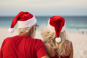 A photo of a couple wearing santa hats together on the beach, seen from behind, christmas festival people image