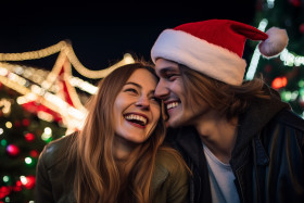 Picture of a young couple having fun at an amusement park on christmas eve, christmas festival people image
