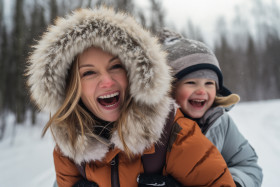 A photo of a happy, loving mother and her daughter having fun and laughing while playing in the snow on a winter walk in nature, christmas festival people image