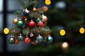 Picture of a christmas tree with ornaments in front of a blurry background, christmas festival celebration images