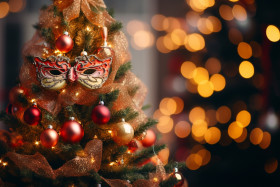 A picture of a christmas tree with decorations, in front of a blurry background, christmas festival celebration images
