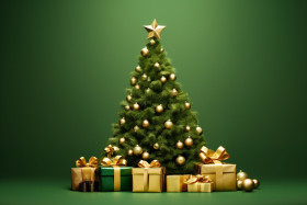 newyear banner christmas tree gold ribbon gift box olive background celebration holiday festive season decoration ornament present celebration greeting card invitation flyer poster template design graphic art winter snow ice frost cold white green red gold silver blue sparkle shine merry bright happy joy peace love hope faith cheer goodwillImagine Buddy