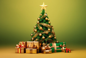 newyear banner christmas tree gold ribbon gift box olive background celebration holiday festive season decoration ornament present celebration greeting card invitation flyer poster template design graphic art winter snow ice frost cold white green red gold silver blue sparkle shine merry bright happy joy peace love hope faith cheer goodwillImagine Buddy