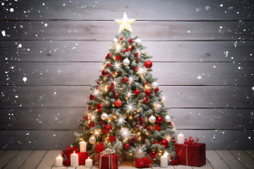 christmas tree fir holly snowfall wooden white board winter holiday festive decoration ornament gift present celebration cheer joy happiness peace love family friends home gathering celebration tradition faith spirit magic season cheer joy happiness peace loveImagine Buddy