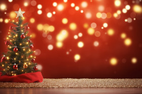 A picture of a christmas scene with a christmas tree and twinkling lights on a red background, christmas festival celebration images