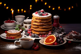 christmas breakfast pancakes waffles eggs bacon sausage toast fruit coffee tea juice milk syrup butter jam jelly chocolate chips nuts whipped cream fruit salad yogurt granola pastries muffins scones bagels croissants danishes danish cinnamon rolls coffee cake hot chocolate eggnog hot apple cider mimosa brunch feast family friends holiday celebration love joy happinessImagine Buddy