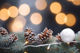 A picture of a christmas banner with snowy ornaments, pine cones, and fir branches, with blurry lights in the background, christmas people celebrating images