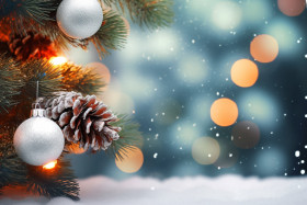 A picture of a christmas banner with snowy ornaments, pine cones, and fir branches, with blurry lights in the background, christmas people celebrating images