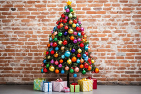 A picture of a christmas tree with colorful ornaments and presents in front of a white brick wall, christmas people celebrating images