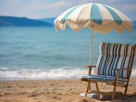 Umbrella and chair with pillow around beautiful landscape of beach and sea, beaches stock images for travel websites