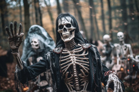 A picture of a skeleton at a halloween party in a graveyard with a foggy forest in the background, halloween party image