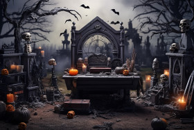 A picture of a halloween-themed wooden table in a spooky graveyard with tombs, halloween party image
