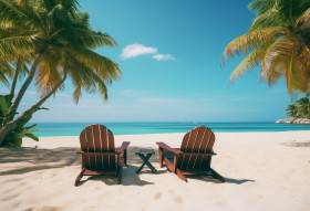 A white sandy tropical beach near palms and palm trees has lounge chairs, beaches stock images for travel websites