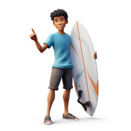 A photo of a fun asian teenager with a surfboard, cartoon character and illustration