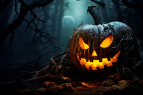 A photo of a halloween pumpkin in a dark forest, with a graveyard in the background, halloween party image