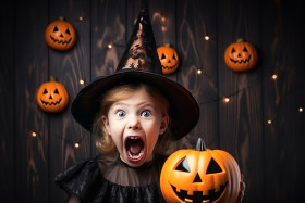 witch costume halloween pumpkin jack orange balloon child girl funny dark wooden background party trick or treat candy sweet spooky scary haunted magic spell wand potion cauldron broomstick flying moon stars night sky cute adorable happy smiley playful mischief tricksterImagine Buddy
