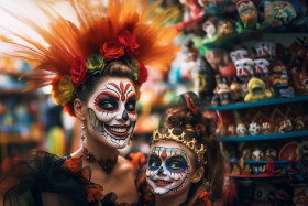 A photo of a happy family getting ready for halloween. a young mom and her child are in costume to celebrate the holiday, halloween celebration image