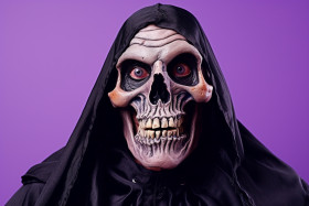 halloween costume death grim reaper skeleton skull makeup cape hood portrait studio scary spooky creepy dark ominous eerie haunting menacing threatening frightening terrifying horror halloweencostume deathcostume grimreapercostume skeletoncostumeImagine Buddy