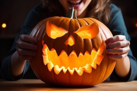 halloween pumpkin carving female home wooden table party jack-o-lantern autumn fall october decoration scary spooky creepy fun festive holiday tradition celebration costume candy trick-or-treat trick or treat trick or treaters candy corn cobwebs bats spiders ghosts haunted haunted house night darkness scary face smiling laughing happy joyful excited anticipationImagine Buddy