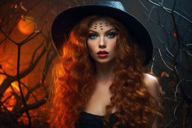 halloween witch girl portrait beautiful young woman hat hair red lips spooky dark magic forest background wide party costume celebration holiday fantasy mystery enchantment spell cauldron broom moon stars night owl bat spider pumpkin ghost skeleton candy trick or treat fun festive spooky scary eerie creepyImagine Buddy