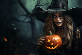 A picture of a young woman dressed as a witch on halloween, holding a carved pumpkin, halloween celebration pictures