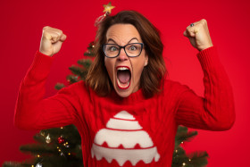 family couple funny crazy happy excited joyful victorious celebrating raising fists screaming yes christmas tree design pullover jeans costume two people wife husband brown hair portrait photo holiday celebration winter family fun family love togetherness happiness celebration of life joy excitement victory cheer happiness laughter fun festive holiday spirit loveImagine Buddy