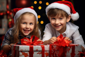A photo of two happy children, a boy and a girl, dressed as santa's elf helpers, holding christmas presents