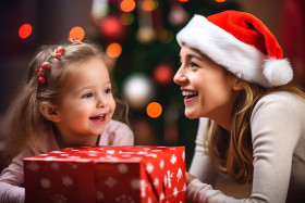 A photo of a happy mother and little girl wearing santa hats and holding a gift box in a living room with a christmas tree in the background