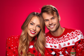 A picture of two people wearing red christmas sweaters, standing in front of a colorful background
