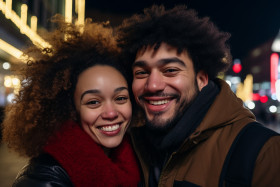 A picture of a happy couple from different races, together outside in the city, celebrating the new yea