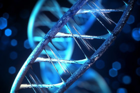 A photo of a human helix dna structure blue color, healthcare stock image