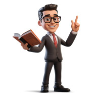 A photo of a cartoon businessman with glasses and is holding a book and pointing up