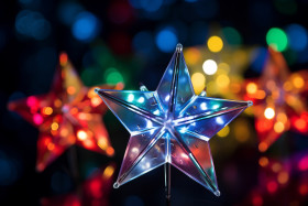 A picture of christmas star lights with blurry shapes and colors in the background